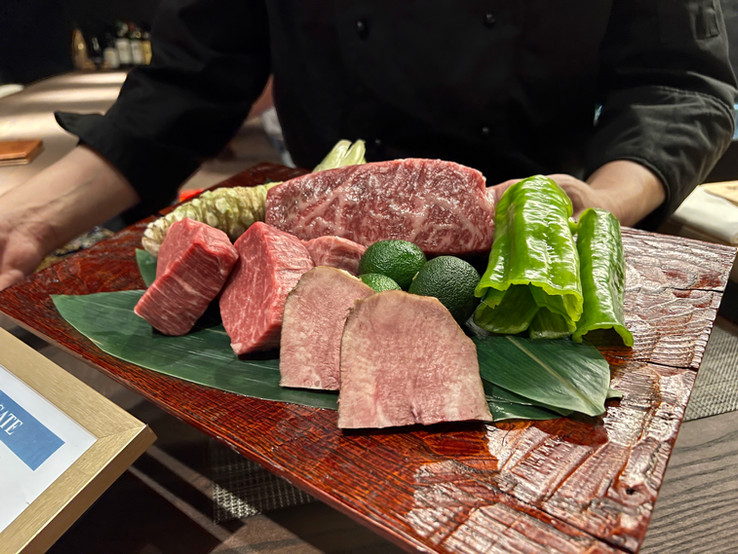 The meal began ceremoniously with a showing of what I would enjoy that night, with different cuts of Kyori beef and a melange of vegetables shown (pictured above) before the first course arrived.